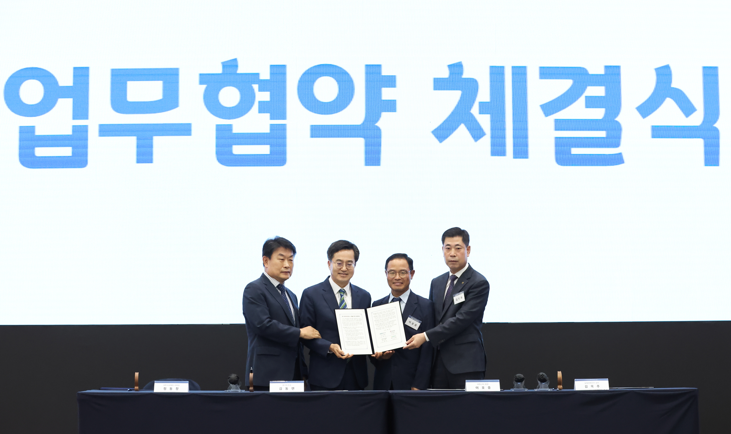 개막식에 이어 RE100 충전소 구축 시범사업 업무협약이 진행됐다. 경기도와 대한석유협회장, 대한LPG협회, 농협경제지주회사는 이날 경기 RE100스테이션 구축을 위한 업무협약을 체결하고 신재생에너지 설비 설치 확대를 위해 협력하기로 했다.