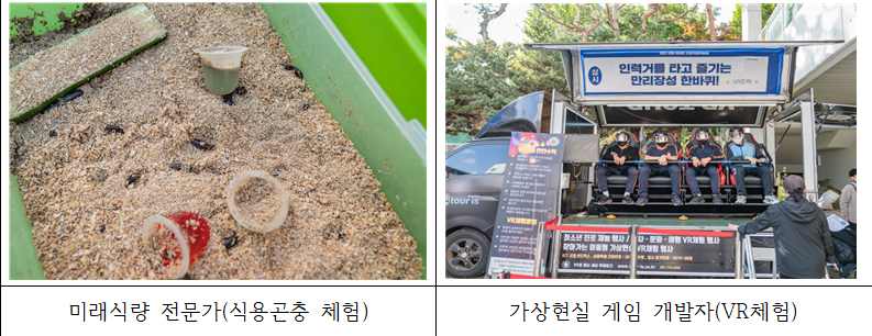 특히, 이색 체험존에서는 미래식량으로 떠오르는 대체 단백질인 식용곤충 핑거푸드 등을 체험해 볼 수 있고, 대체 단백질 산업에 대한 전문가의 설명을 들으며 ‘미래식량 전문가’ 직업군에 대한 진로 탐색도 해볼 수 있다.