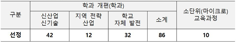 이중 신산업·신기술 분야로 개편한 학과는 42개이며, 전공과 융합해 신산업·신기술 분야 역량을 함양하는 모듈형 과정인 소단위(마이크로) 교육과정은 총 10개 과정이 선정됐다.