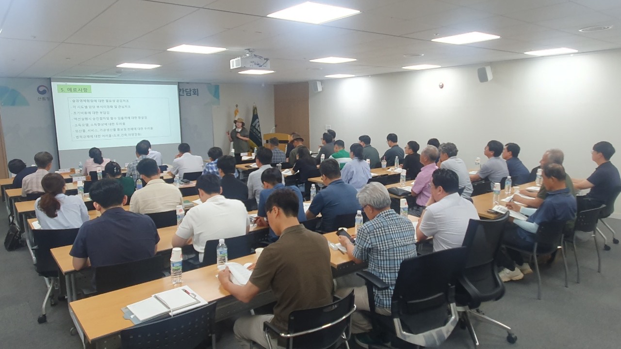 산림청(청장 임상섭)은 대전광역시에 위치한 임업진흥원 산촌활성화지원센터에서 임업인, 숲경영체험림 운영자, 지방자치단체 등 40여 명이 함께 숲경영체험림의 활성화 방안에 대해 논의했다고 23일 밝혔다.